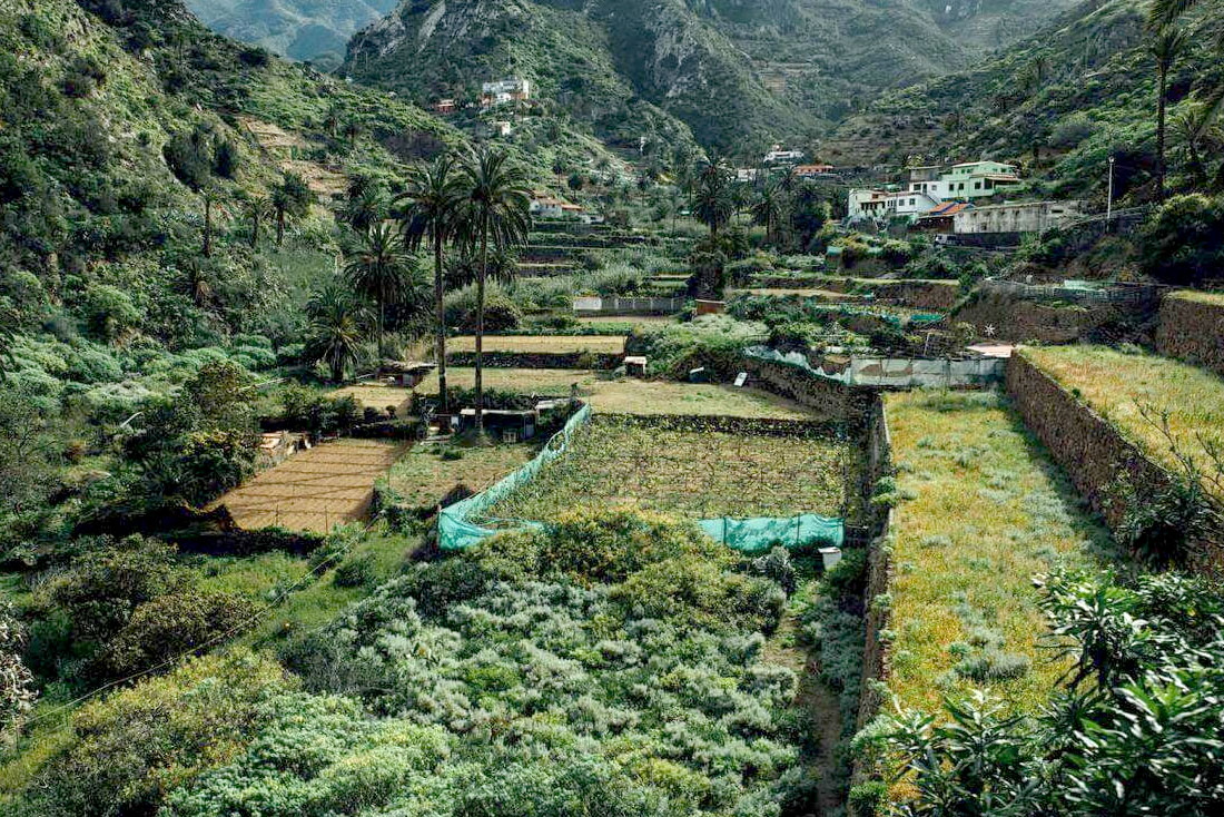 conjunto singular de bancales y palmeras, con unas 35 edificaciones poco